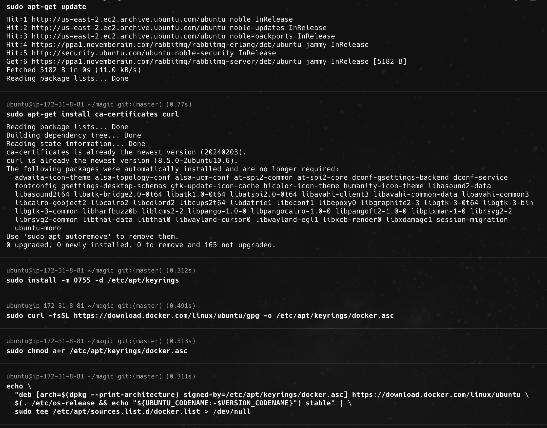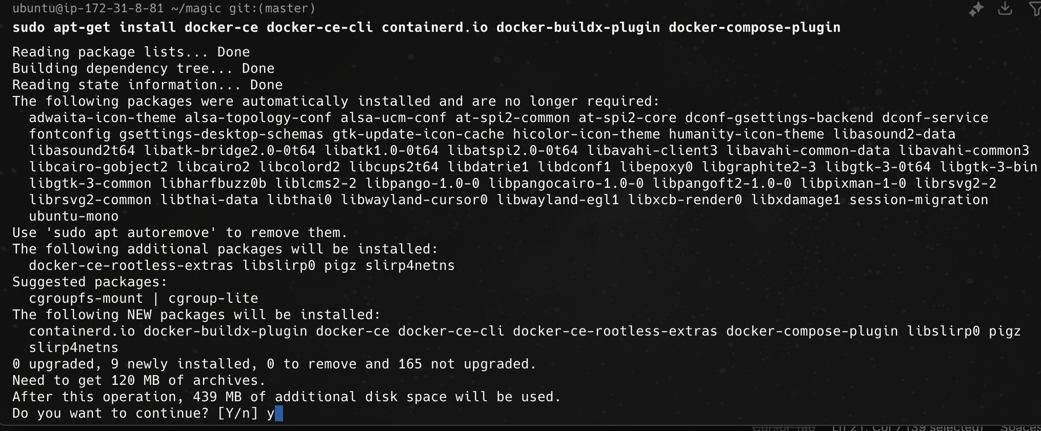 sudo apt-get install docker-ce docker-ce-cli containerd.io docker-buildx-plugin docker-compose-plugin